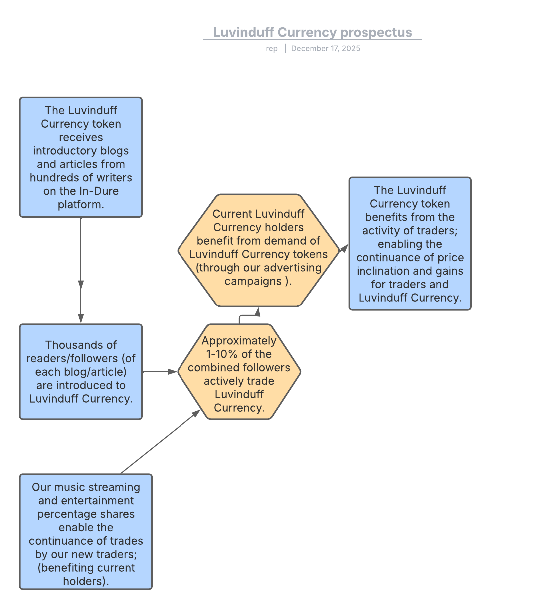 Luvinduff (LVD) is the official native currency for the InDure arts platform and Luvinduff Community. The token serves both as a platform token and a transactional token.